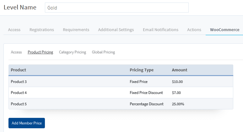 As an example, this means you could set a 25% off discount for all products to the members in the Gold level.