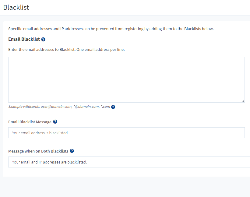 - Enter the message you would like displayed to those who attempt to register, but are blacklisted in the Email Blacklist Message box provided.