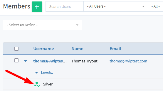 The screenshot example below shows a user who registered for the Silver level. The user has the Unconfirmed status for the level since the Silver level requires the user to confirm through email.