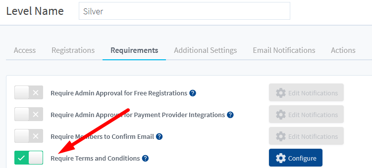 If enabled, the user will be required to click a checkbox acknowledging they accept the terms and conditions before registering for the membership level.