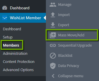 To move or add groups of members (en masse) between membership levels, navigate to Members > Mass Move/Add.