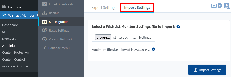 You will see two tabs in the Administration > Site Migration section of WishList Member. One for Export and one for Import. This allows you to export settings to use on another WishList Member site or import settings from another WishList Member site.