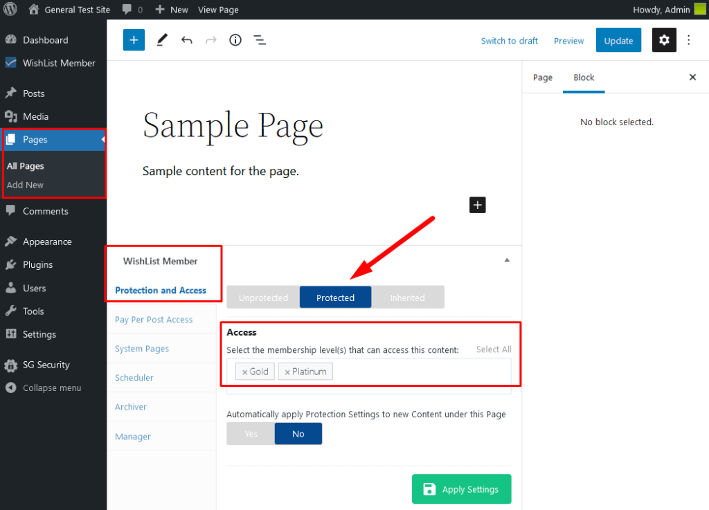 The screenshot example below shows a page set as protected and it can only be accessed by members with the Platinum or Gold membership level.