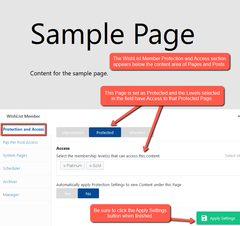 Protection basically works as an On / Off switch. WordPress pages, posts, categories, etc. can be set as protected. Each piece of content can either be set as protected or unprotected using WishList Member.