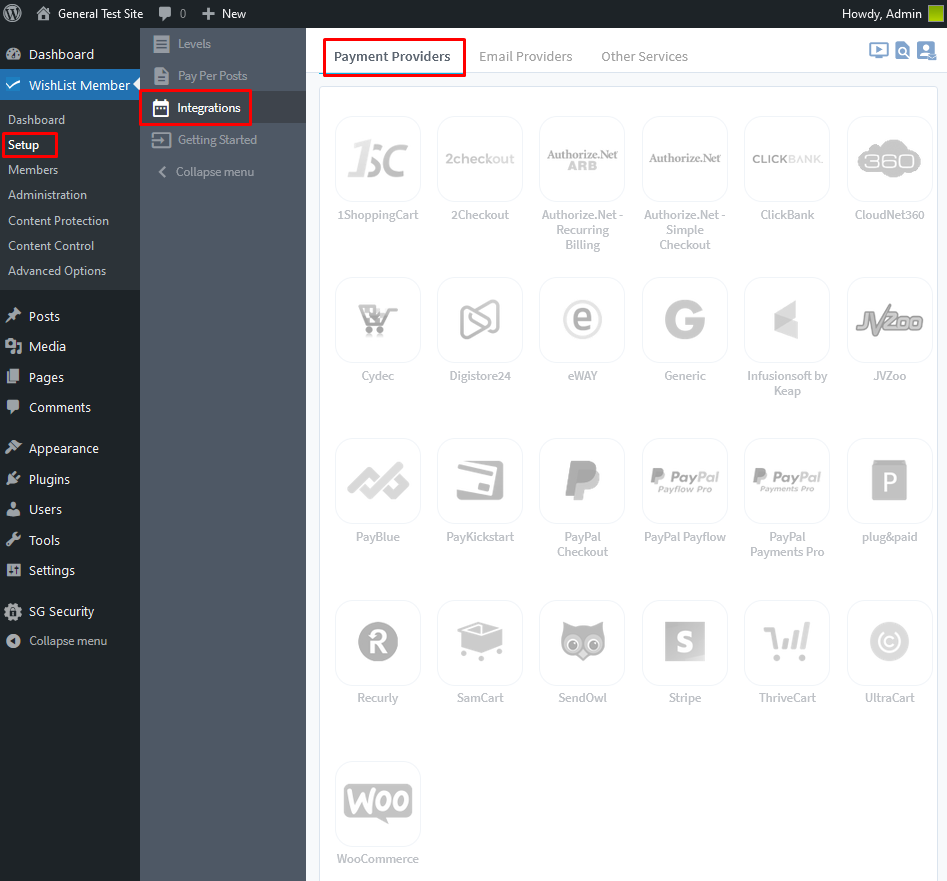 You can view and enable any of the payment provider integration options in the Setup > Integrations > Payment Providers section in WishList Member. Integrating with a payment provider allows you to accept payment for registration to your site.