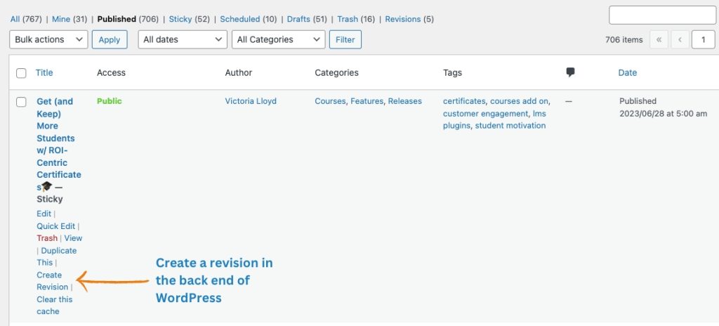 - Clicking the “revision” link generates a new draft of the post, separate from the published version.