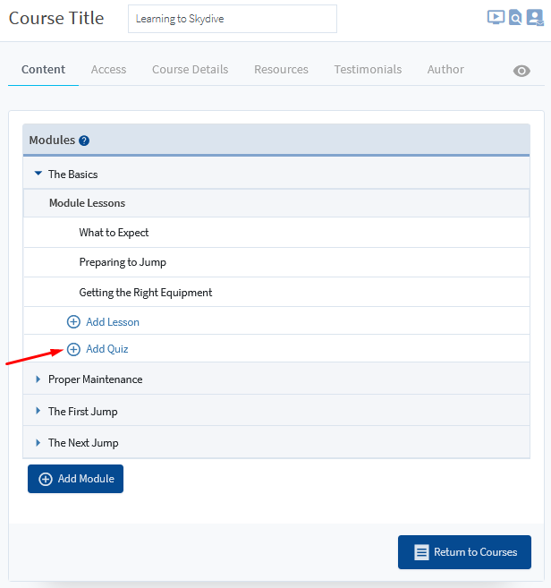 Once you have at least one course and quiz created, you can add a quiz at any point to a Course.
