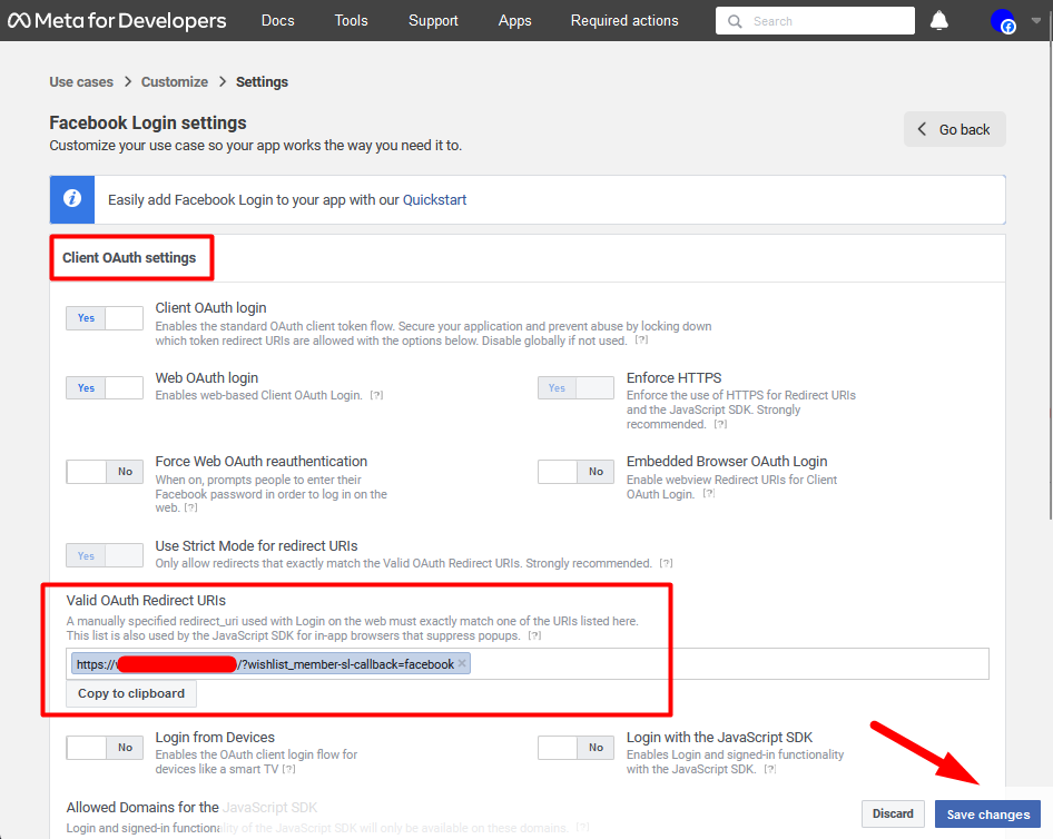 Add the following URL to the “Valid OAuth redirect URIs” field and click the Save Changes button. You will need to replace YOUR-SITE-URL with your actual site URL.