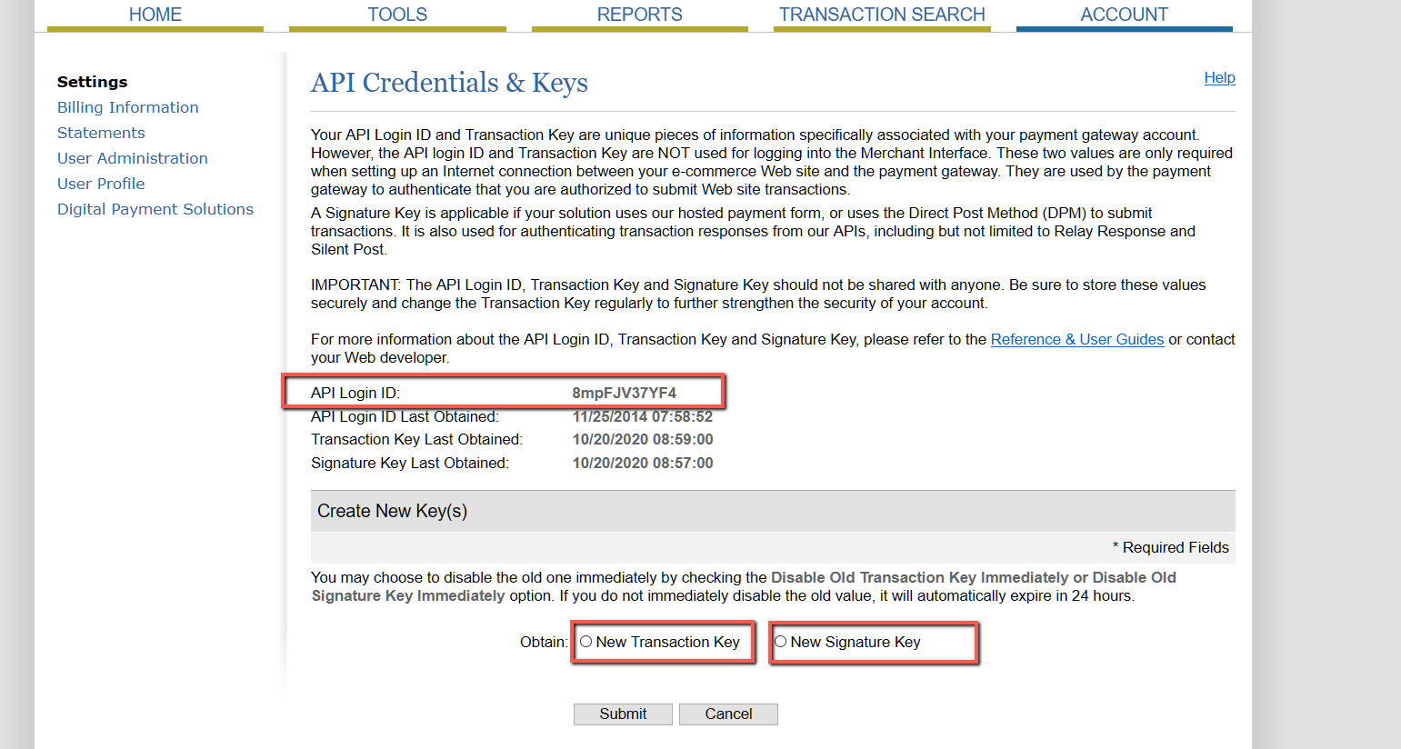 1. Get the API Credentials (API Login ID, Transaction Key, Signature Key) from the Authorize.net account.