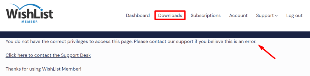 You may also see the You do not have the correct privileges to access this page. Please contact our support if you believe this is an error message.