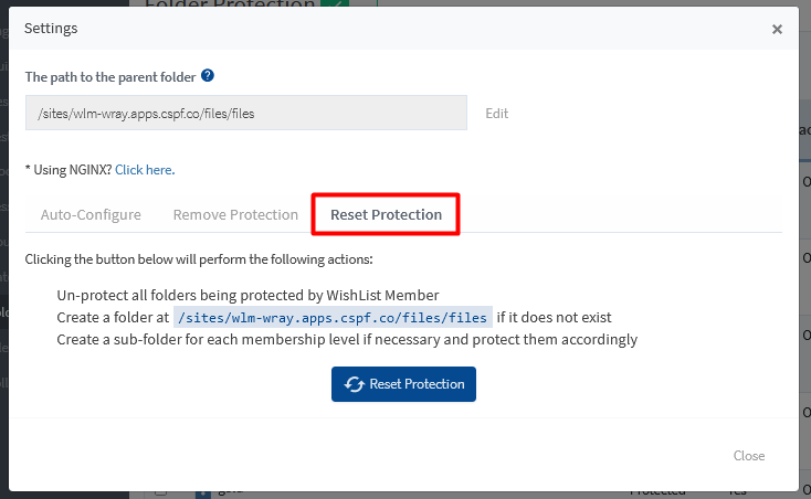 You have the option to reset protection for all folders. The Reset Protection button can be used to reset the Folder Protection back to it's original settings. This will also create a new folder if it does not already exist and a sub-folder for each membership level will also be created (and protected).