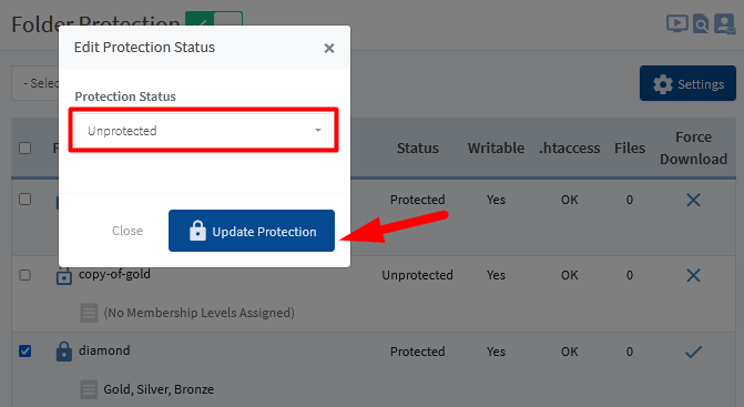 In this example, the checkbox to the left of the “diamond” folder is checked and Edit Protection Status has been selected from the Select an Action dropdown.
