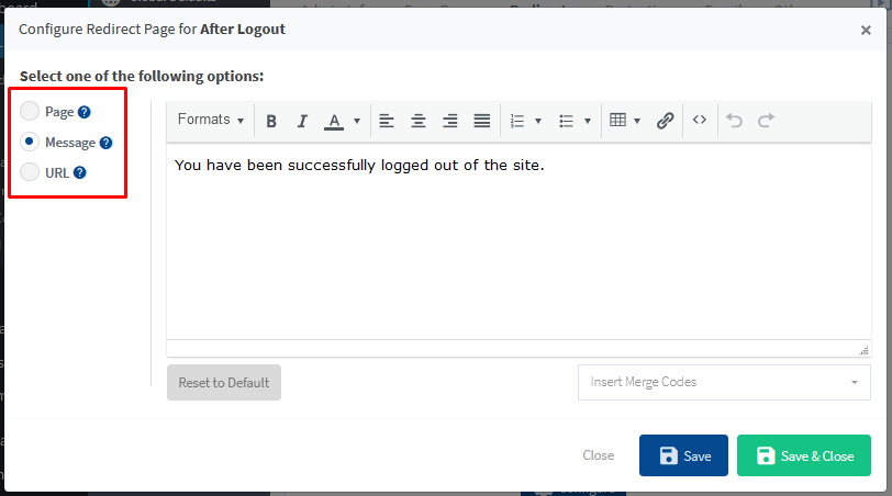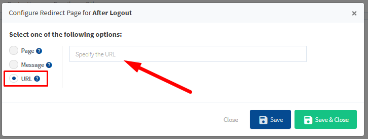 The Configure Redirect Page for After Logout popup will appear and you can select Page, Message or URL. Lets touch on each of these options below.