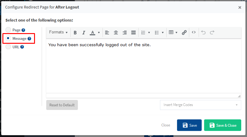 A default message is available and can be set to be displayed when members logout of your site. The message can be edited or you can add a completely new message.