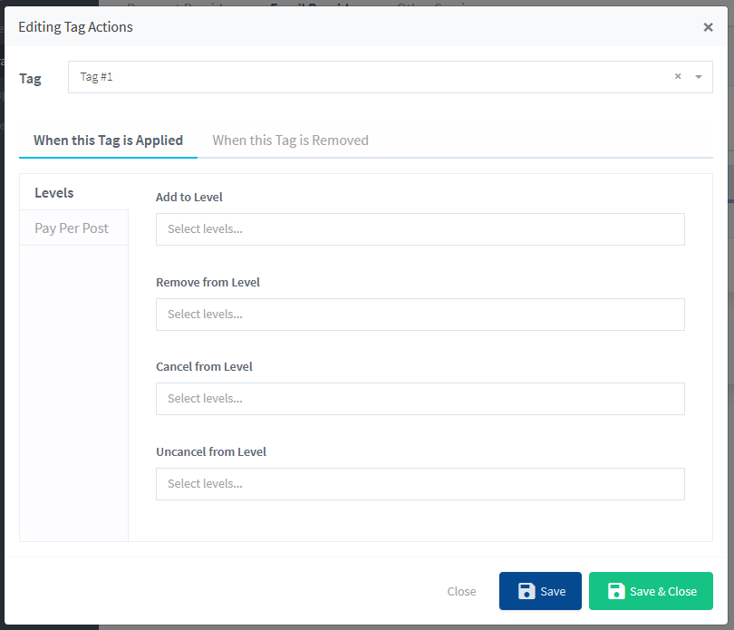 When this Tag is Applied: Set if a Member should be Added to a Level or Removed from a Level or Cancelled from a Level or Uncancelled from a Level when the Tag is Applied.