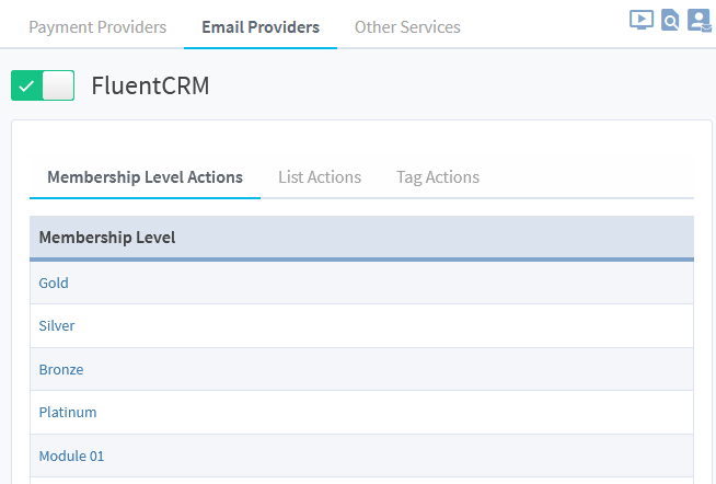 Next, you can select and enable the FluentCRM option in the Integrations > Email Provides section of WishList Member.