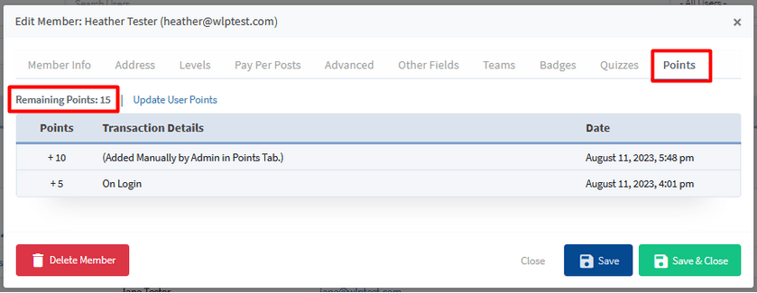 This screenshot example shows a member with a total of 15 Points. The member had 5 Points added based on a Points Rule related to logging into the site and also had 10 Points manually added by the site admin.